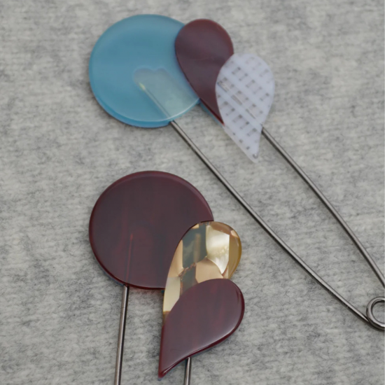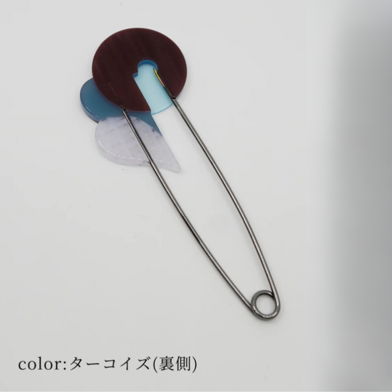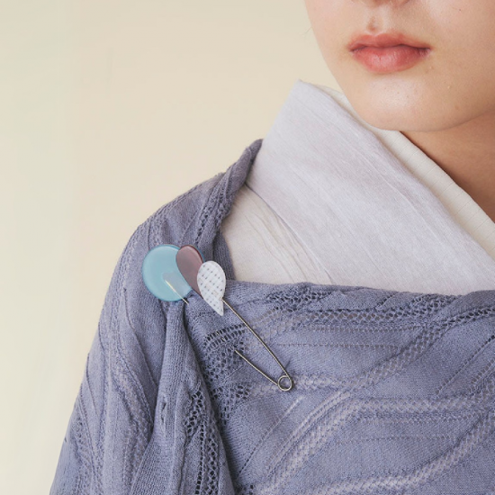 「クラウド型ストールピン」は、雲の形をイメージして、丸い形としずくのような形にカットしたアセテート樹脂を組み合わせています。