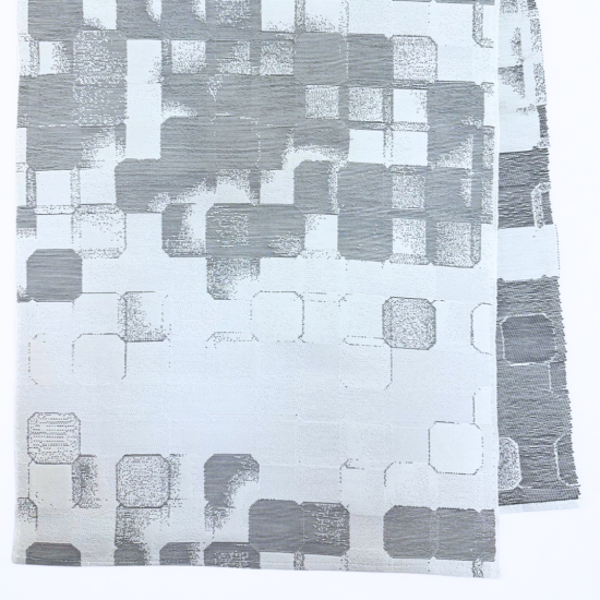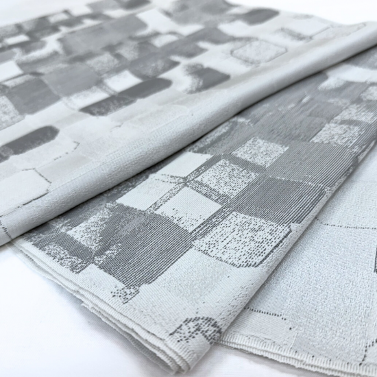 この製品は糸と特殊な箔糸をヨコ糸に織り込み、柄やボリューム感をだしています