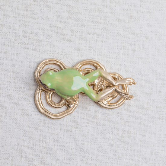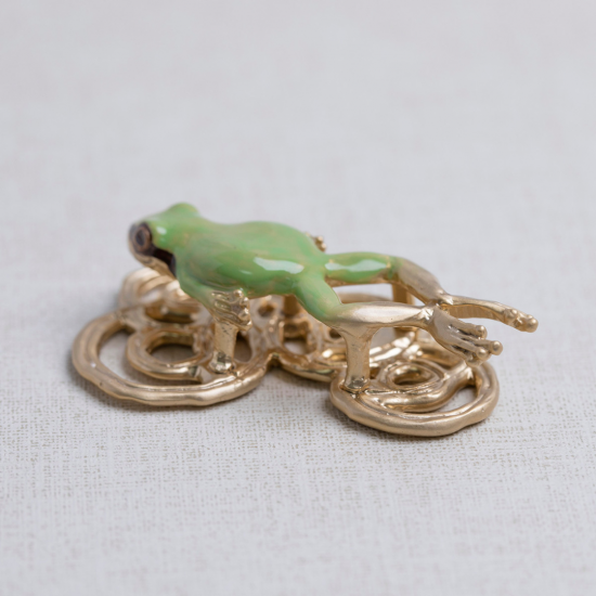 水の中を気持ちよさそうに泳ぐアマガエルの帯留め。