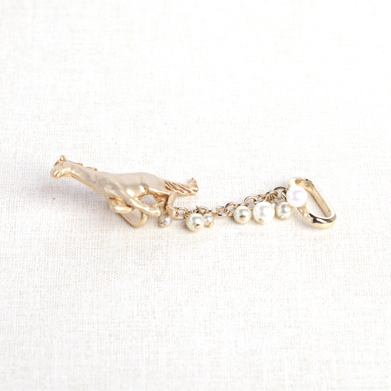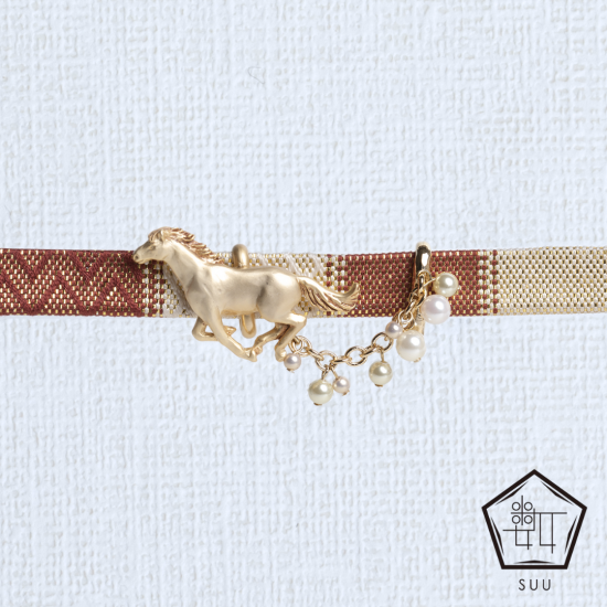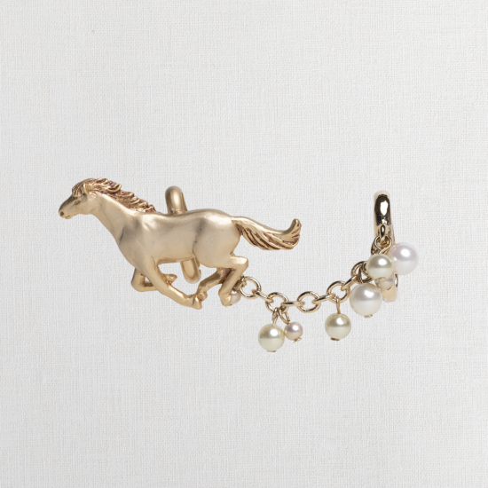 風を切っていくようなスピード感を演出するため2つのパーツに分け、馬の足元から舞い上がる土埃をイメージしたパールがゆらゆらと揺れます。